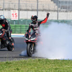 Il circuito di Misano ha vissuto una giornata senza respiro, con il paddock sempre animato dal palco di radio DeeJay che ha scandito i tempi della festa tra un evento e l’altro. Il momento più atteso in pista è stata la Race of Stars, la spettacolare gara a coppie e con partenza in stile Le Mans, che ha visto battagliare in pista le Aprilia RS 660 Factory. Alla fine di undici divertentissimi giri, pieni di colpi di scena e dopo due cambi pilota, ha vinto la coppia formata da Bezzecchi e Corradini davanti a Kevin Calia e The A (il pilota misterioso di Aprilia). Sul podio anche Raul Fernandez in coppia con Emily Bondi, risultata alla fine la migliore delle tre ragazze al via. Le altre erano Maria Herrera, vicecampionessa mondiale, e Roberta Ponziani.