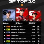 Settima posizione per Joan Mir (Honda HRC Castrol), davanti a Marco Bezzecchi. Il romagnolo targato Aprilia Racing ha replicato la rimonta dalla 20esima all’ottava posizione realizzata ieri nella Tissot Sprint. Ha preceduto Fabio Di Giannantonio (Pertamina Enduro VR46 Racing Team) e Raul Fernandez (Trackhouse Racing MotoGP), che hanno completato la top ten. Alex Rins (Monster Energy Yamaha MotoGP), undicesimo, è stato il più veloce in sella alla M1.