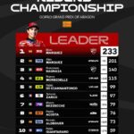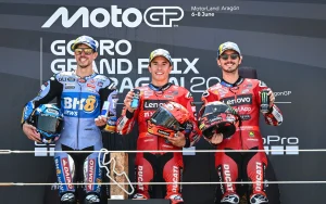Il GP di Aragon è dominio assoluto di Marc Marquez, in testa in tutte le prove, qualifiche, Sprint e gara, un risultato che in MotoGP non si verificava dal 2015, quando a riuscirci era stato proprio lui, al Sachenring sulla Honda. Secondo il fratello Alex, con Francesco Bagnaia finalmente sul podio, risultato importante per cancellare le ultime prestazioni deludenti. Il numero 63, che ha lamentato problemi di feeling con la GP25, guarda ora con fiducia al prossimo round iridato, in programma al Mugello, dove negli ultimi due anni ha fatto il pieno di punti. Ad Aragon ha chiuso con due secondi di ritardo dal compagno di squadra.