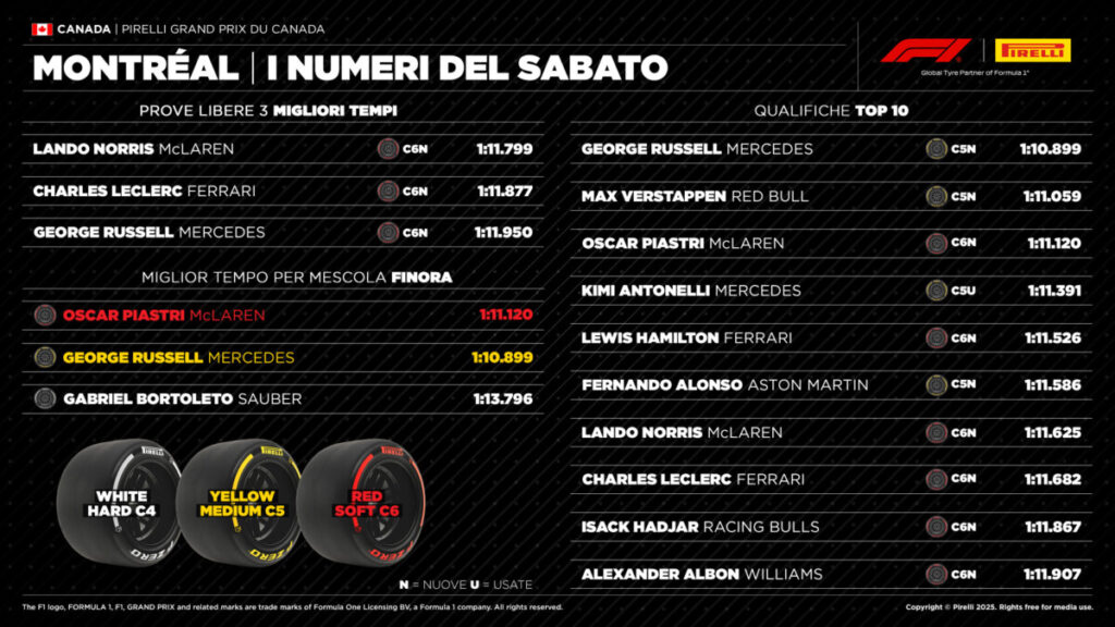 Nella terza sessione di prove libere la Soft è stata ancora una volta la protagonista assoluta, con la maggior parte dei piloti (Verstappen, Antonelli, Russell, Stroll, Alonso, Colapinto, Gasly, Lawson, Hadjar, Albon, Sainz, Hulkenberg e Bortoleto) che hanno usato solamente la C6, al netto di chi – le coppie di Mercedes, Aston Martin e Racing Bulls – ha effettuato il rodaggio di uno o più set di Hard. In qualifica c’è stato un utilizzo molto più esteso della norma della mescola Medium, con otto piloti (Verstappen, Antonelli, Russell, Stroll, Alonso, Colapinto, Gasly e Albon) che hanno montato uno o più set di C5 a scapito del tradizionale impiego della mescola più morbida a disposizione.