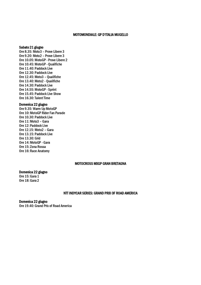 La MotoGP sbarca all’Autodromo Internazionale del Mugello per il GP d’Italia, primo dei due appuntamenti tricolore in calendario. Un fine settimana di passione e adrenalina, con i piloti pronti a darsi battaglia tra le curve del circuito toscano. Nel weekend anche l’MXGP e NTT Indycar Series.