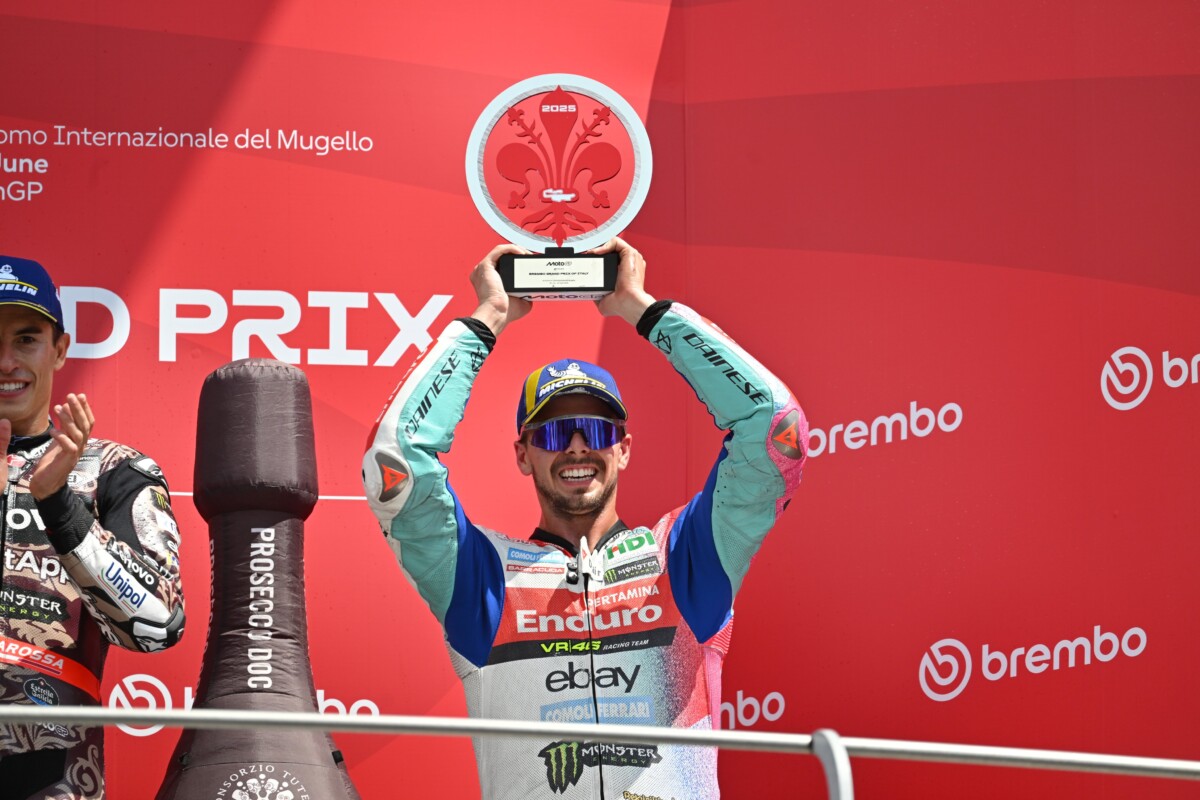 La gara di casa ha sempre un sapore speciale, ma con i colori “Cremonini Live 25” lo è ancora di più: il Pertamina Enduro VR46 Racing Team conquista il podio nel GP d’Italia con Fabio Di Giannantonio, che ottiene il secondo podio della stagione. Sesta posizione finale per Franco Morbidelli. Di Giannantonio partiva dalla terza fila della griglia di partenza e sin da subito ha mostrato un grande ritmo che gli ha consentito di essere in lotta per il podio. Fabio ha portato la Ducati Desmosedici GP al terzo posto nel finale di gara con una bella rimonta e grandi sorpassi ottenendo il suo miglior risultato in carriera al Mugello. Fabio rimane quinto nella classifica generale con 120 punti.