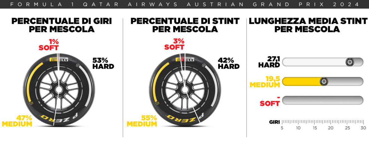 Resta invariata rispetto allo scorso anno la selezione di mescole a disposizione delle squadre: C3 come Hard, C4 come Medium e C5 come Soft. L’asfalto del Red Bull Ring è piuttosto datato e ha un livello di rugosità elevato ma l’usura non è un fattore determinante. Con pochissime curve, il Red Bull Ring non è molto severo in termini di forze laterali esercitate sui pneumatici mentre il degrado ha una origine prevalentemente termica, soprattutto per le diverse, brusche frenate e accelerazioni determinate dalla conformazione del tracciato. La gestione del surriscaldamento delle gomme, in particolare sull’asse posteriore, rappresenta una sfida importante. Inoltre, possono esserci temperature di aria e asfalto piuttosto elevate, data la collocazione nel calendario.