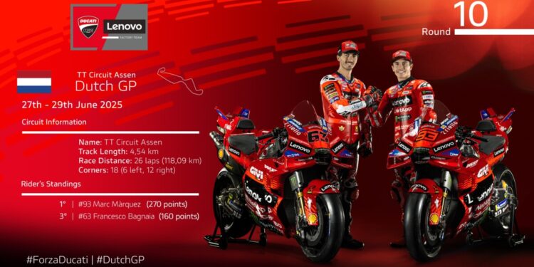Il TT Circuit di Assen apre le porte al Circus della MotoGP per il decimo round della stagione. Un tracciato storico, velocissimo e molto tecnico, l’unico a ospitare (tranne nel 2020) il Mondiale di motociclismo in tutte le edizioni dal 1949 a oggi. Quattro in totale le vittorie Ducati: nel 2008 Stoner e Bagnaia dominatore delle ultime tre edizioni 22, 23 e 24. In uno stato di grazia e direttamente dal Mugello, dove ha centrato pole position, vittoria nella Sprint e primo posto nel GP, Marc Márquez (due vittorie in Olanda nella top class per lui – 2014 e 2018) è pronto a tornare in sella alla Desmosedici GP su questo tracciato che, almeno sulla carta, nel recente passato, sembra esaltare al meglio le caratteristiche della Ducati. Trionfatore ad Assen in tutte le categorie del Campionato e capace di fare la differenza su tutti nelle ultime tre edizioni, Francesco Bagnaia cercherà di ricucire ulteriormente il gap dai primissimi dopo un weekend dolce amaro davanti al pubblico di casa.