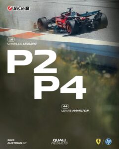 Charles Leclerc ha conquistato il secondo posto nelle qualifiche del GP d’Austria, mentre Lewis Hamilton partirà dalla quarta posizione. Si tratta della miglior qualifica stagionale per il team, che eguaglia il risultato di Monaco (dove però Lewis partì settimo a causa di una penalità).