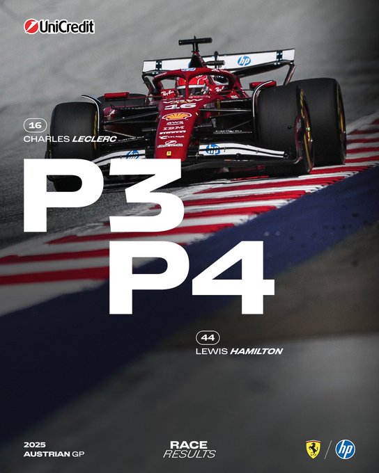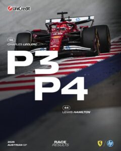 Charles Leclerc e Lewis Hamilton hanno chiuso rispettivamente al 3° e 4° posto nel GP d’Austria. La partenza della gara è stata annullata e posticipata di 15 minuti, dopo che Carlos Sainz non è riuscito a partire dalla griglia per il giro di formazione. La Safety Car è entrata in pista al primo giro in seguito a una collisione tra Kimi Antonelli e Max Verstappen. Charles e Lewis sono partiti con gomme Medium e hanno seguito una strategia a due soste, passando prima alle Hard e poi nuovamente alle Medium per lo stint finale.