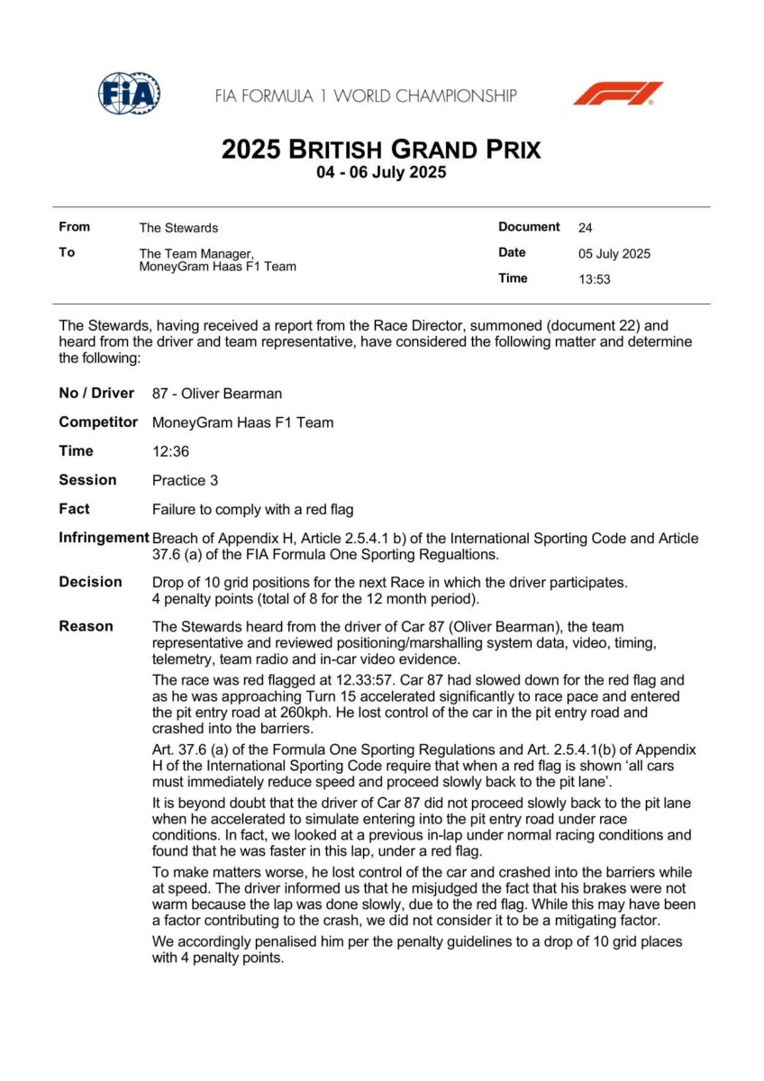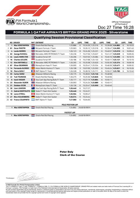 Dopo le speranze per le prestazioni nelle libere, la Ferrari non riesce ancora a mettere tutto insieme in qualifica e domani Lewis Hamilton e Charles Leclerc (che non hanno cercato di nascondere la delusione) partiranno dalla terza fila, con Kimi Antonelli autore del settimo crono, che però sconterà tre posizioni per la penalità ricevuta per l’incidente con Verstappen in Austria. Ottavo tempo per Ollie Bearman, ma la Haas in gara partirà da fondo griglia, dopo 10 posizioni di penalità avute per infrazione commessa in regime di bandiere rosse durante le FP3.