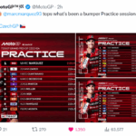 All’Autodrom Brno la Practice del GP della Repubblica Ceca inizia con 20 minuti di ritardo e su pista bagnata. Nella sessione che chiude il venerdì il migliore ancora è una volta Marc Marquez (Ducati Lenovo Team) che in 2:03.935 si mette alle spalle i due francesi Johann Zarco (CASTROL LCR Honda) e Fabio Quartararo (Monster Energy Yamaha MotoGP Team).