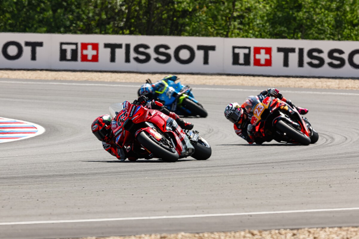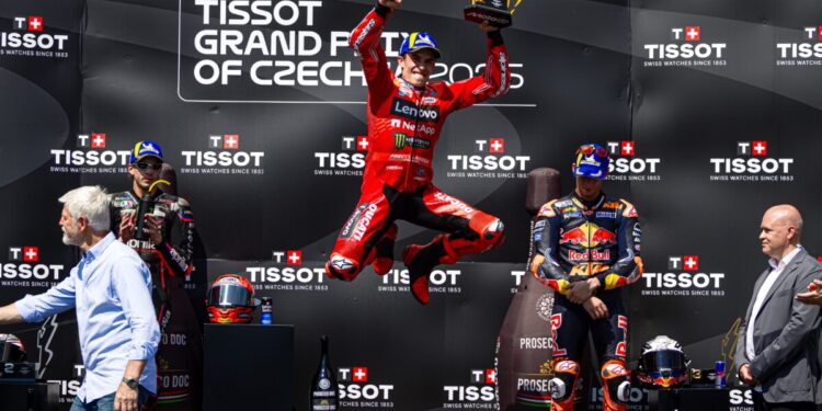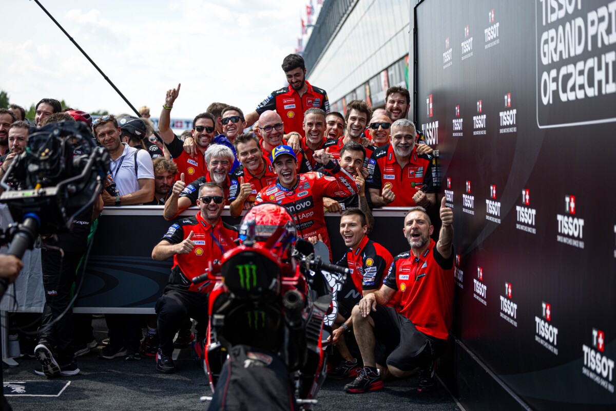 Marc Marquez ha riscritto una parte importante della storia Ducati all’Automotodrom Brno diventando, con la Desmosedici GP del Ducati Lenovo Team, il primo pilota di Borgo Panigale a conquistare cinque successi di fila in gara. Bagnaia si ferma a mezzo secondo dal podio in quarta posizione, dopo un’ottima rimonta nel finale. Márquez ha mantenuto la seconda posizione al via e, dopo un breve periodo in testa, è sceso al terzo posto. Tornato secondo nel giro seguente, Marc è rimasto in scia a Bezzecchi fino all’ottavo passaggio, superandolo alla curva tre per poi prendere il largo definitivamente nella seconda metà di gara. Bagnaia, dopo un buon inizio, ha poi perso contatto con il terzetto di testa. Nel finale, Pecco ha trovato un ottimo passo, non riuscendo però a chiudere definitivamente il gap con Acosta per il terzo posto.