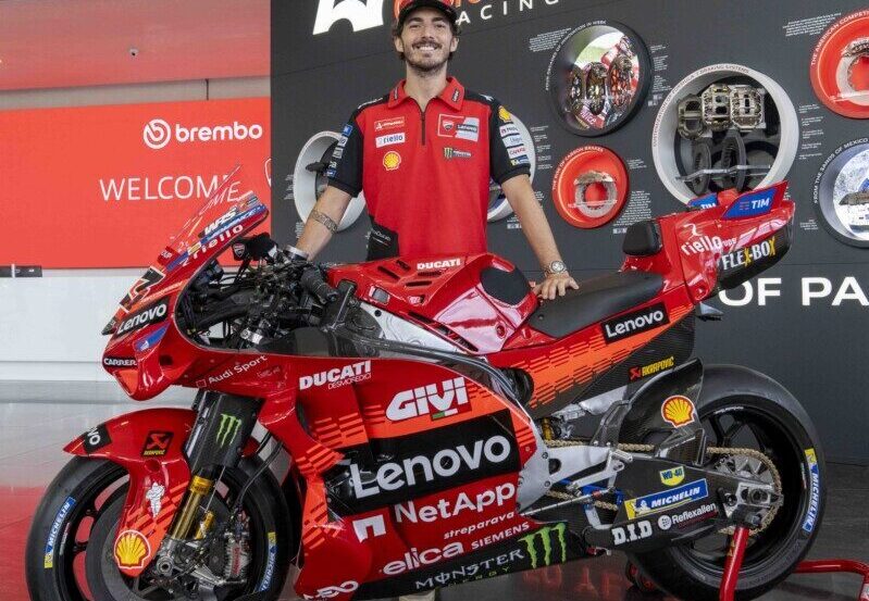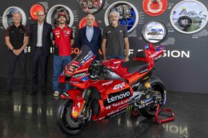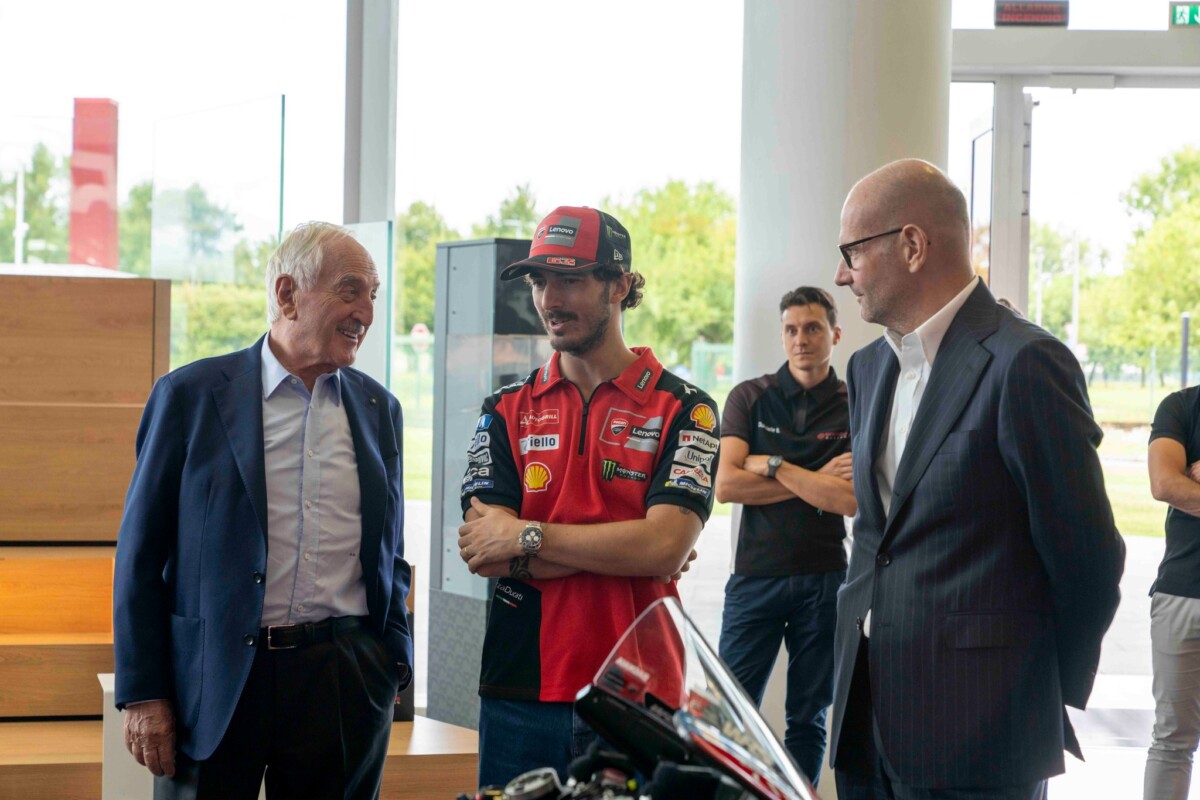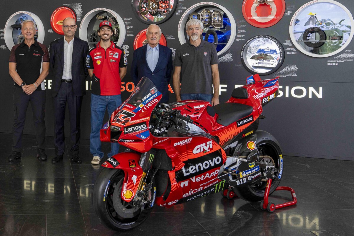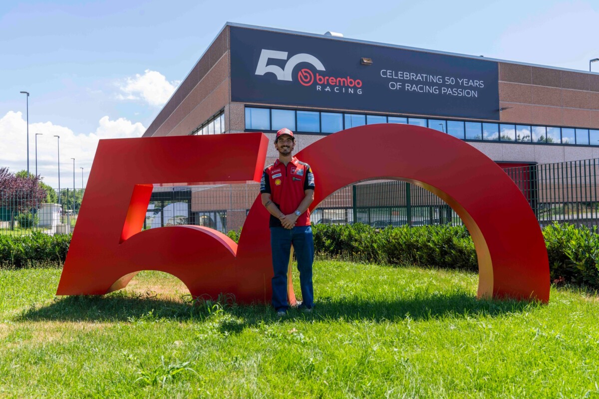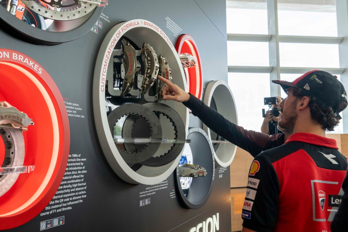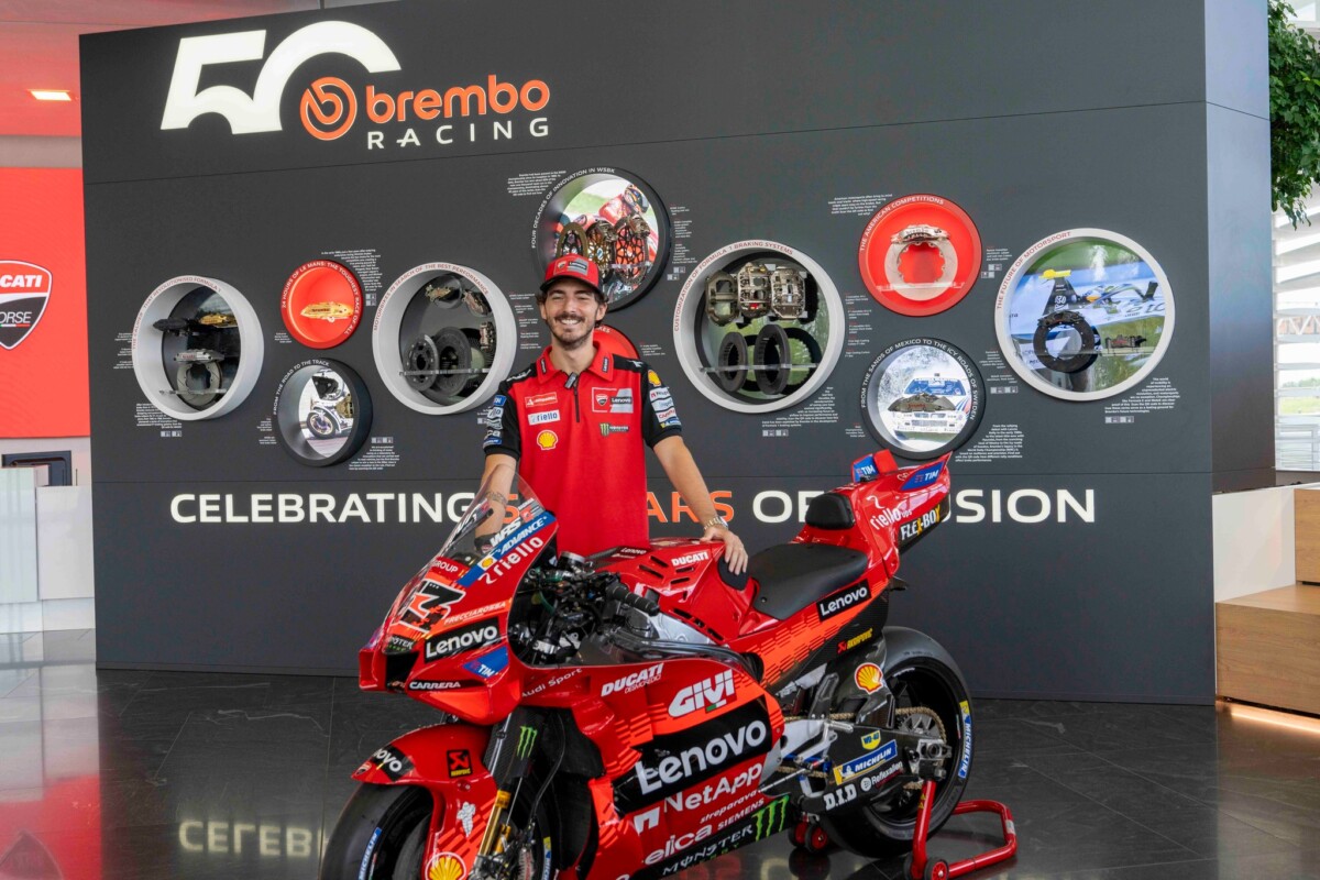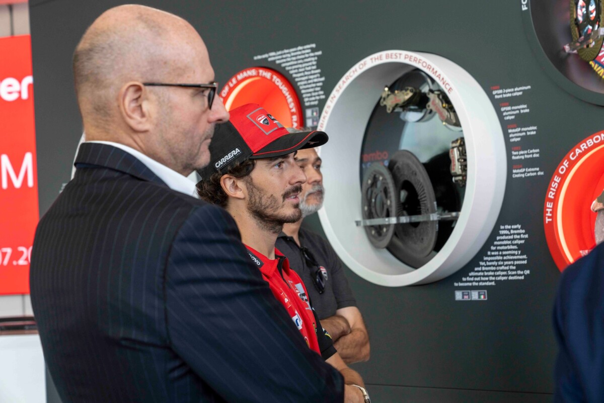 Bagnaia e il Management Ducati Corse sono stati accolti dal Top Management di Brembo, più precisamente da Matteo Tiraboschi, Presidente Esecutivo, Alberto Bombassei, Presidente Emerito, e Mario Almondo, COO Brembo Performance. All’arrivo presso l’Headquarter generale, situato all’interno del Kilometro Rosso, c’era anche la Ducati Desmosedici GP di Pecco, posizionata proprio di fronte alla nuova parete esplorativa installata da Brembo per celebrare i 50 anni nel Racing: accompagna dal claim “celebrating 50 years of passion” la parete mette in risalto le principali innovazioni proposte da Brembo, in 50 anni di storia, nelle principali competizioni Racing: dalla Formula 1 alla MotoGP, passando per il WEC, la WorldSBK, la Formula E, la MotoE, Nascar e WRC.
