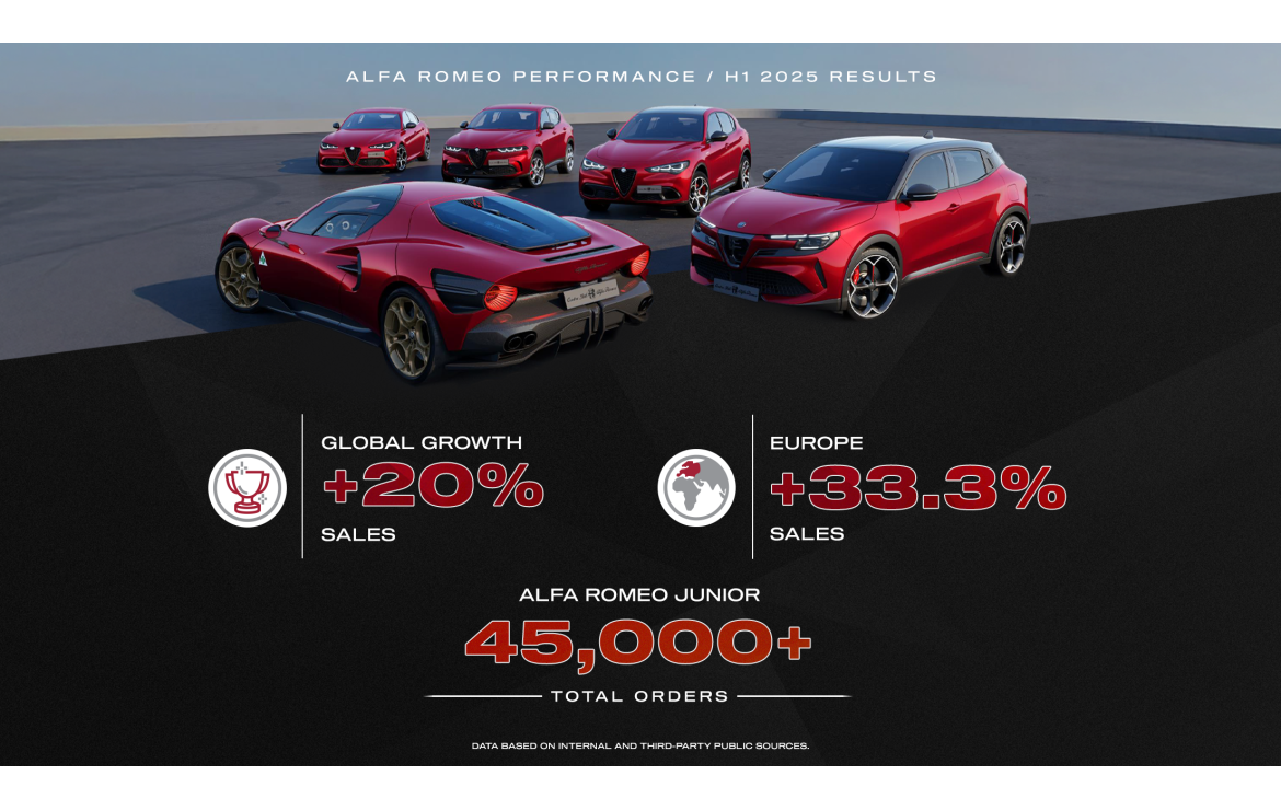 In uno scenario sociale e di settore in costante evoluzione, Alfa Romeo continua a crescere a livello globale: nel primo semestre del 2025, le immatricolazioni del brand fanno registrare un aumento del 20% rispetto allo stesso periodo del 2024, confermando un trend positivo in termini di volumi e di consolidamento della quota di mercato. Un risultato riflette il successo di una gamma completa impreziosita dalla nuova compatta Junior che è stata accolta con grande entusiasmo confermando la capacità di Alfa Romeo di evolversi restando fedele al proprio DNA, fatto di sportività e saper fare italiano.