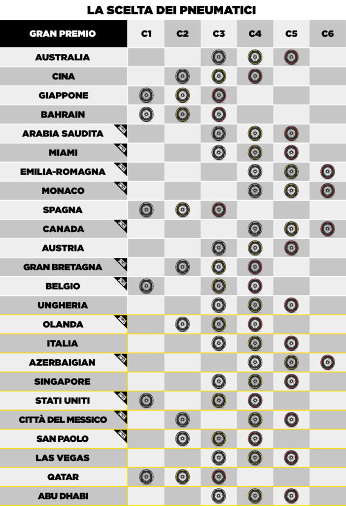 Nelle rimanenti cinque gare non ci sono variazioni rispetto al 2024. C3 come Hard, C4 come Medium e C5 come Soft saranno protagoniste nel GP d’Italia a Monza, in quello di Singapore, a Las Vegas e ad Abu Dhabi. In Qatar, una delle gare più probanti per le gomme di tutta la stagione, la terna sarà la più dura della gamma 2025 (C1 come Hard, C2 come Medium e C3 come Soft).
