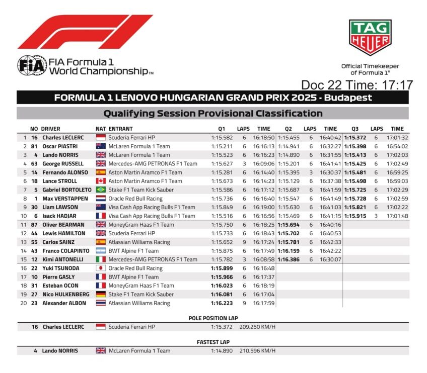 Fred Vasseur: “Non è stata una pole facile, dato che abbiamo faticato in Q1 e Q2 a portare le gomme nella giusta finestra di utilizzo e non siamo andati lontani dall’avere entrambe le vetture eliminate in Q2. Le condizioni erano molto mutevoli, con persino un po’ di pioggia nella seconda sessione. Alla fine, Charles è riuscito a trovare il modo per mettere le gomme nella giusta finestra e posizionarsi correttamente nel giro di lancio. È stato un giro eccezionale e una prestazione molto positiva, considerando quanto sia ridotto il divario tra la P10 e la P1. Lewis era molto vicino a Charles in Q2, e non ce l’ha fatta a qualificarsi per la Q3 per appena 15 millesimi. Sicuramente avrà una gara difficile. Per quanto riguarda domani, abbiamo visto ieri che avevamo un passo gara forte e costante anche rispetto alla McLaren. In gara dovremo concentrarci su noi stessi, avere una buona strategia e l’approccio giusto nella gestione delle gomme. Se faremo questo, potremo ottenere un buon risultato, visto che il nostro passo gara è generalmente più competitivo rispetto al nostro ritmo in qualifica”.