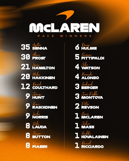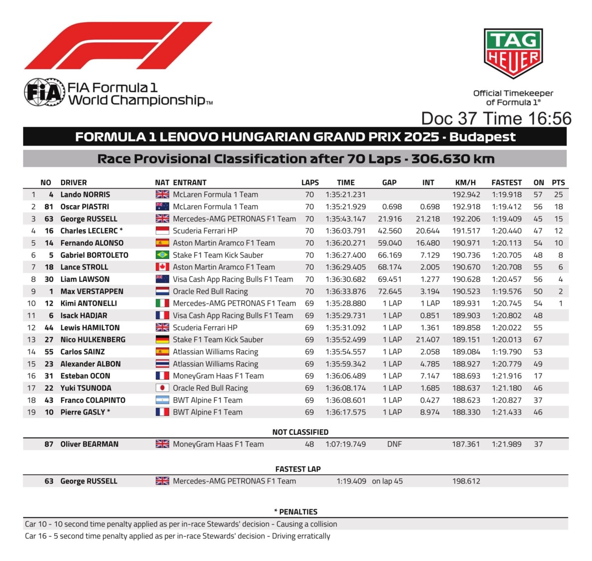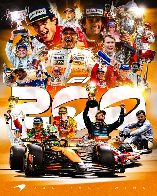 Nelle fasi finali il passo del ferrarista è crollato drammaticamente (2 secondi al giro, con team radio di fuoco e dichiarazioni contraddittorie alla fine. Leclerc che ha parlato di problemi al fondo di cui era stato informato dopo e Vasseur di problemi di pressione), mentre Piastri si è lanciato alla caccia di Norris, incollato negli ultimi giri. Ma, nonostante un paio di tentativi, il numero 81 non è riuscito a passare il compagno di squadra, che ha tagliato il traguardo con 0.698s di vantaggio, conquistando la quinta vittoria della stagione e riducendo il vantaggio di Piastri in classifica Piloti a 9 punti. E regalando anche la vittoria numero 200 al team di Woking, che oggi festeggia anche la quarta doppietta consecutiva, cosa che non si verificava dal 1988, con Prost e Senna.