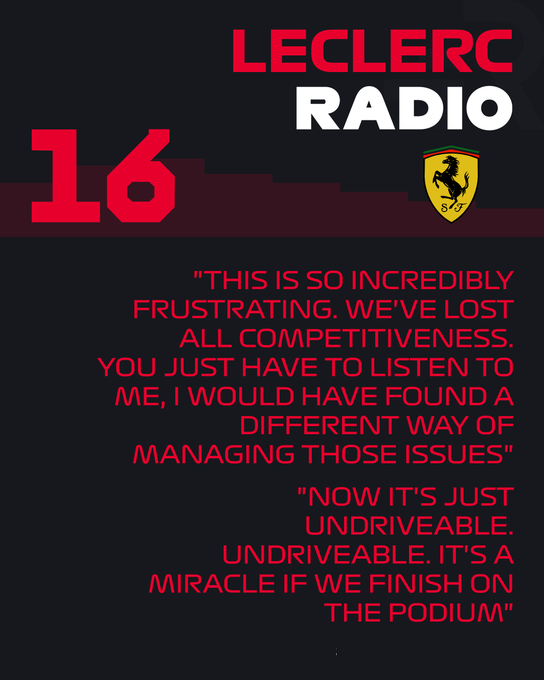 Ci sembra invece impossibile sperare che a Maranello smettano di dire “dobbiamo capire cosa è successo“. Leclerc oggi è stato chiaro nei team radio e siamo portati a credere che “il telaio… la pressione...” siano solo delle scuse studiate male a tavolino. Mettetevi almeno d’accordo, prima di rilasciare dichiarazioni alle TV, perché restano, non solo il comunicato stampa sterile che rilascerete tra qualche ora. Perché sapete, signori di Maranello, tifosi, addetti ai lavori ma soprattutto i piloti sarebbero un po’ stanchi di essere presi in giro… e in questo weekend sia Leclerc sia Hamilton – ognuno a modo suo – ve le hanno cantate chiare in diretta mondiale.