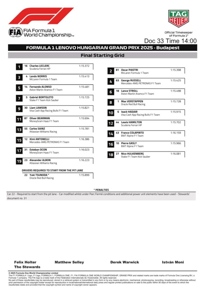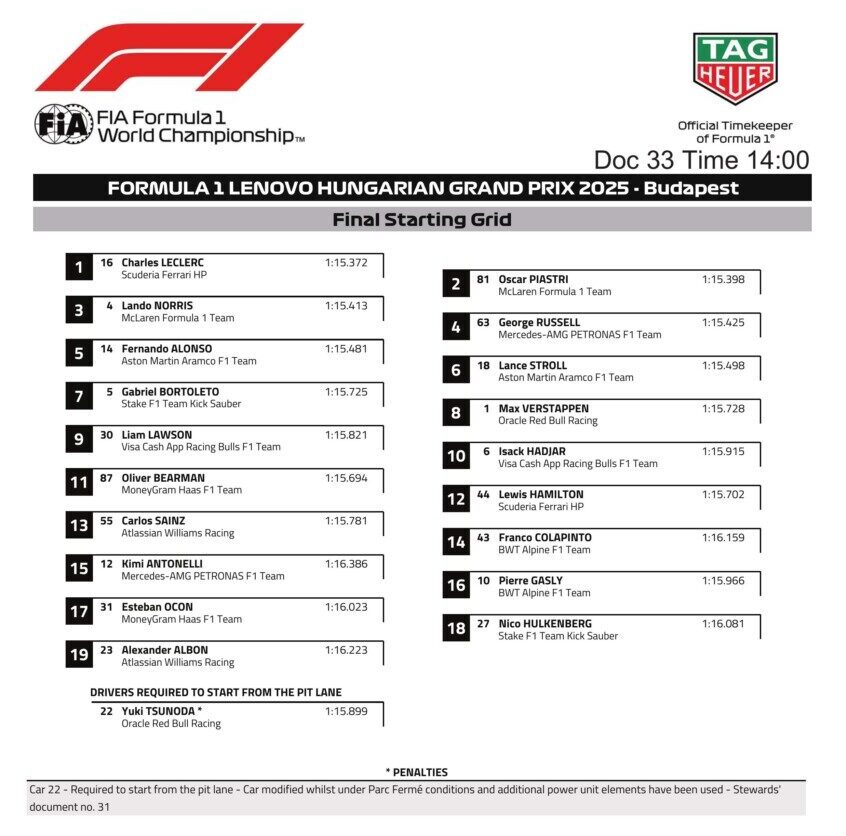 Manca poco al via del GP di Ungheria, quattordicesimo round del campionato di F1 2025. Prima fila per il poleman Charles Leclerc e Oscar Piastri, seguiti da Lando Norris e George Russell. Terza fila tutta Aston Martin, con Fernando Alonso e Lance Stroll. Dietro di loro Gabriel Bortoleto e Max Verstappen, a chiudere la top 10 le Racing Bulls di Liam Lawson e Isack Hadjar. Nella 12° piazzola la Ferrari di Lewis Hamilton, chiamato a una delle sue grandi rimonte. Unica penalità per la Red Bull di Yuki Tsunoda, che dovrà partire dalla pitlane per interventi fatti sulla monoposto in parco chiuso. Buon divertimento e buon GP a tutti!