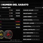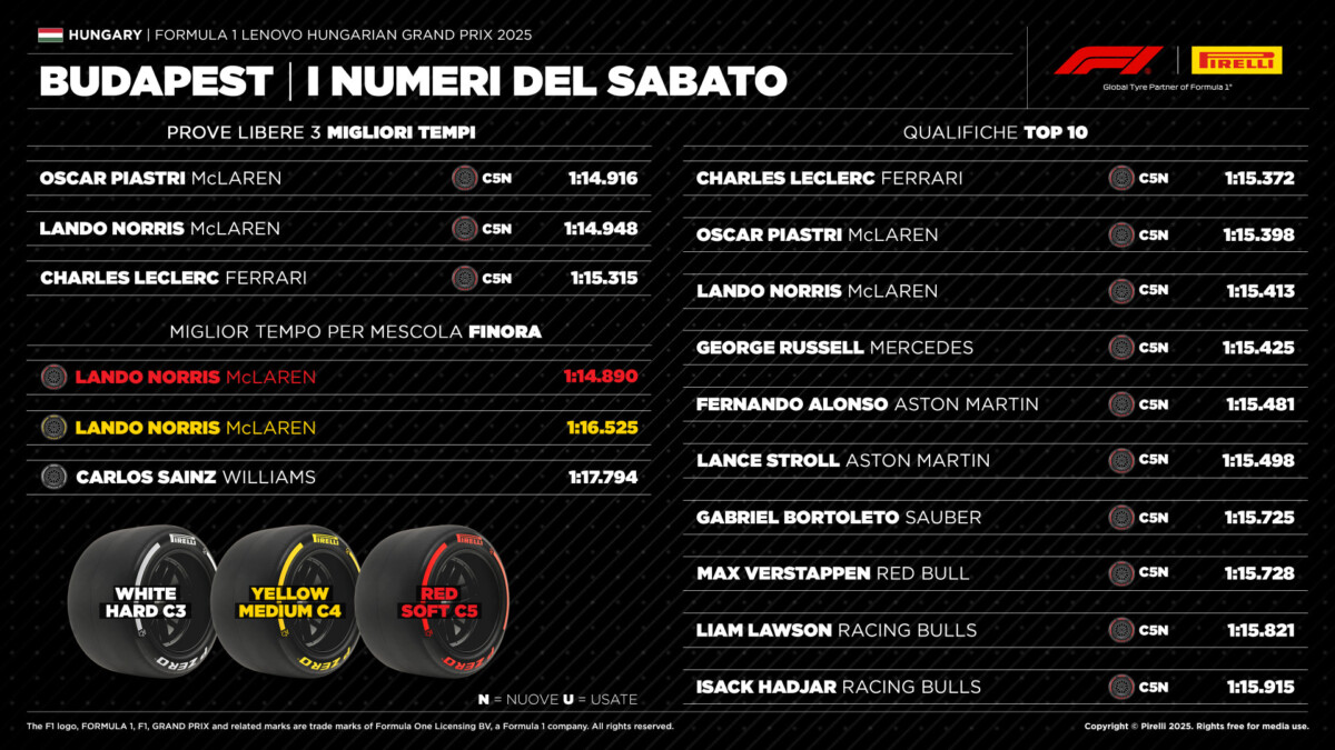 I primi quattro classificati sono racchiusi in appena 51 millesimi di secondo: 1’15”372 per Leclerc, 1’15”398 per Oscar Piastri, 1’15”413 per Lando Norris e 1’15”425 per George Russell. Soltanto poco più di mezzo secondo ha separato il tempo della pole da quello del decimo classificato, Isack Hadjar (Racing Bulls) che ha fermato il cronometro sull’1’15”915. Da segnalare che il miglior tempo assoluto della giornata è stato fatto segnare da Lando Norris in Q2 (1’14”890) e il tempo della pole di Leclerc gli sarebbe valso solamente il quinto posto nel segmento centrale della qualifica. Nelle precedenti 39 edizioni di questa gara, ben 24 volte il vincitore è partito dalla prima fila (16 volte dalla pole, otto dalla seconda posizione). Soltanto quattro volte chi è passato per primo sotto la bandiera a scacchi era partito da una posizione in griglia inferiore alla quarta: la più lontana dalla pole è stata la quattordicesima (Jenson Button nel 2006 con la Honda).