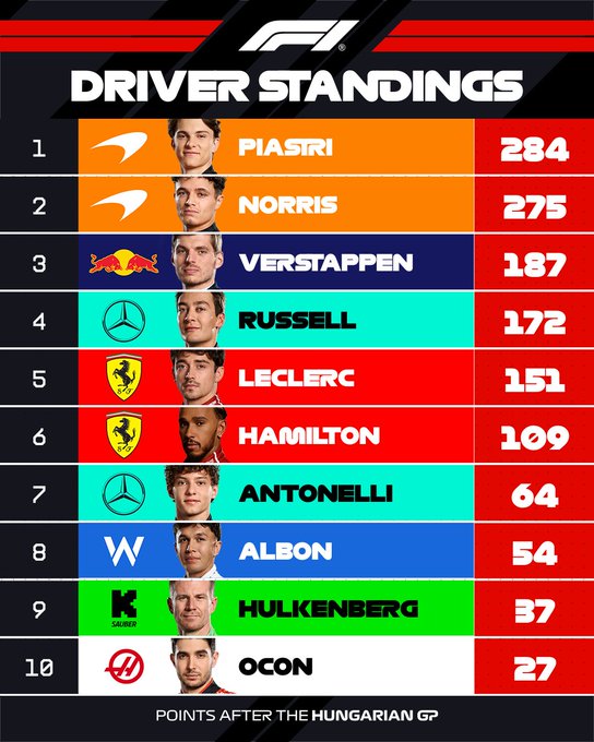 All’Hungaroring la McLaren ha messo a segno la settima doppietta stagionale, la quarta consecutiva, a dimostrazione di una supremazia disarmante. Fino a questo momento sia Norris sia Piastri si sono resi protagonisti di un duello molto leale, come poche volte abbiamo visto. Hanno saputo gestire al meglio qualsiasi tipologia di strategia, diversificandole (giustamente) tra i due piloti, con Norris che si è guadagnato il successo in pista.