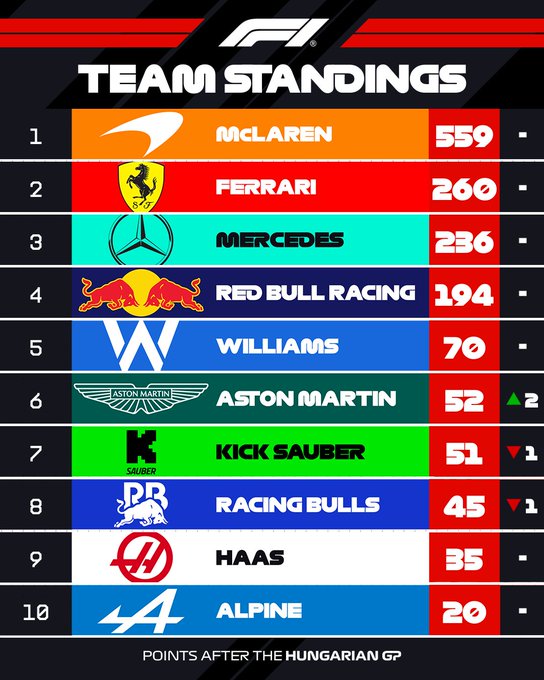Ancora un risultato positivo per la Sauber, con Gabriel Bortoleto che ha lottato con il suo manager Fernando Alonso, quinto al traguardo. Il brasiliano sta mettendo in difficoltà il suo compagno di squadra, confermando il suo ottimo passato nelle formule minori. Reduce da alcuni appuntamenti negativi, l’Aston Martin è rinata, portando entrambe le vetture in zona punti. Nono posto, assolutamente anomalo, per Max Verstappen che, nonostante abbia lottato con le unghie e con i denti, ha tagliato il traguardo con un ritardo superiore ai 70 secondi dalla McLaren. Ora ci attendono quasi quattro settimane di pausa prima della ripartenza con il GP d’Olanda.
