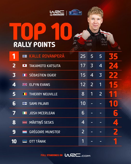 Con la sua ottava vittoria su nove rally in questa stagione, TGR-WRT aumenta il suo vantaggio nel campionato costruttori a 87 punti. Sami Pajari ha completato il risultato perfetto al quinto posto assoluto con una delle sue migliori corse in Rally1 fino ad oggi nel suo evento di casa, ottenendo tre vittorie di tappa insieme al copilota Marko Salminen. È solo la seconda volta che un costruttore si aggiudica i primi cinque posti alla fine di una prova del WRC, dopo la Lancia in Portogallo nel 1990. Anche Juha Kankkunen, ora vice direttore tecnico di TGR-WRT, ha fatto parte di quel risultato come pilota, finendo terzo.