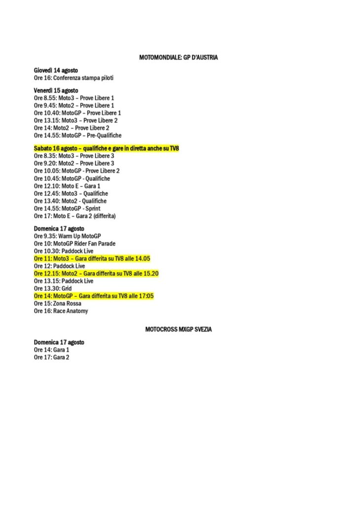MOTOMONDIALE AL RED BULL RING – Da giovedì 14 a domenica 17 agosto, appuntamento in diretta esclusiva con la tredicesima prova – e prima tappa dopo la pausa estiva – del mondiale 2025 di MotoGP, il GP d’Austria. Si parte con la conferenza stampa piloti giovedì alle 16.00. Venerdì, alle 10.40, la prima sessione di prove libere, a seguire, alle 14.55, le prequalifiche. Sabato, alle 10.05, la seconda sessione di prove libere. Poi, alle 10.45, appuntamento con le qualifiche, mentre alle 14.55 scatta la Sprint. Chiude il weekend la gara, con il semaforo verde previsto alle 14.00. Nel weekend in pista anche Moto2, Moto3 e Moto E.