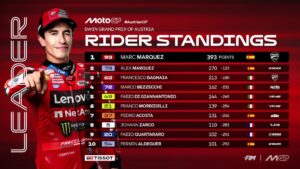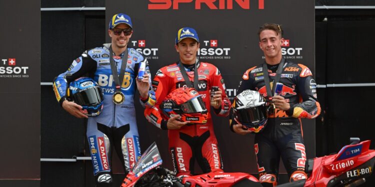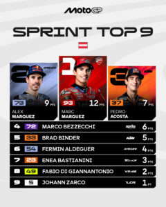 Marc Marquez (Ducati Lenovo Team) riparte da dove aveva terminato la prima parte di stagione, ovvero con una vittoria. Lo spagnolo è superiore a tutti gli altri anche nella Sprint del GP d’Austria: al Red Bull Ring centra la sua 12^ vittoria su 13 Sprint finora e allunga ancora sul fratello Alex Marquez (BK8 Gresini Racing MotoGP), oggi secondo davanti a Pedro Acosta (Red Bull KTM Factory Racing), sul podio in quello che per KTM è il GP di casa. Sabato agrodolce nel box Ducati Lenovo Team, con Francesco Bagnaia (Ducati Lenovo Team) costretto al ritiro per problemi tecnici.