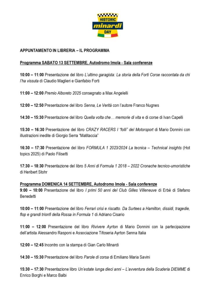 Oltre all’intensa attività in pista con le esibizioni di straordinarie vetture storiche tra le quali oltre 20 Formula 1 – tra cui Minardi in rappresentanza dei 40 anni dal debutto in F1 di Gian Carlo Minardi, Ferrari, Williams, Lotus, Tyrrell, March, Monteverdi, Merzario, Wolf, Fondmetal, Shadow, Arrows e McLaren tra cui la MP4/5B del 1990 protagonista della serie “SENNA” – GP2, Formula 2, Formula 3, F3000, Formula Junior, GT Storiche, Prototipi che hanno scritto le pagine più importanti del motorsport internazionale unitamente anche alle vetture della Scuderia Nuvolari Italia, della Scuderia del Portello Alfa Romeo, del Raduno Terre di Romagna all’interno dell’ACI Storico Festival, all’eleganza e alla tecnologie delle supercar e hypercar Pagani, Dallara, Lamborghini, Pambuffetti e Mazda, l’intenso programma è arricchito da numerose attività all’interno dell’area paddock, con aree dedicate ai simulatori professionali, al modellismo, villaggio automobilia e mostra LEGO®. Imperdibili le presentazioni di libri delle più autorevoli firme del motorsport presso la Sala Conferenze.