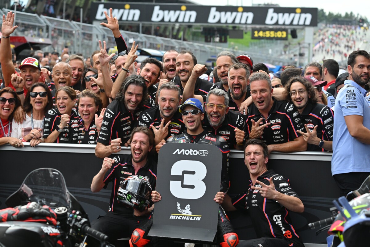 La gara lunga del GP d’Austria per Aprilia Racing si è chiusa con alti e bassi: da un lato la gioia per il podio di Marco Bezzecchi, dall’altro l’amarezza per la caduta di Jorge Martín. Il pilota italiano ha preso subito il comando alla prima curva, mantenendo la leadership per buona parte della gara con grande determinazione. Nella fase finale ha ceduto la testa, chiudendo con un eccellente terzo posto e regalando ad Aprilia Racing il sesto podio stagionale, tra cui la vittoria conquistata a Silverstone. Un risultato che rappresenta anche il miglior piazzamento di sempre per la Casa di Noale su questo tracciato, storicamente una delle piste più ostiche per la RS-GP. Giornata più complicata per Jorge Martín che, dopo una buona partenza e un’intensa battaglia nelle prime fasi, è stato vittima di una caduta al quattordicesimo giro. Fortunatamente, il pilota spagnolo non ha riportato conseguenze fisiche, ma l’incidente ha compromesso ogni possibilità di portare a casa un buon risultato.