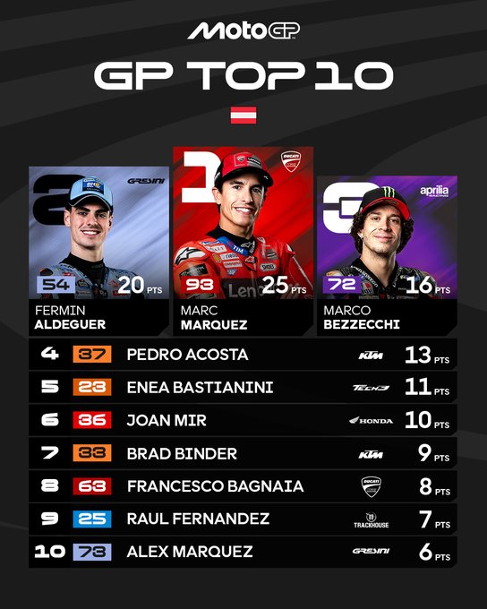 MARCO BEZZECCHI: “Sono molto contento, è stata una gara bellissima. Considerando come abbiamo iniziato il venerdì, chiudere il weekend con la pole position e un podio è incredibile. Sono davvero soddisfatto del lavoro fatto insieme al team. La battaglia in testa è stata bella, ho dato il mio massimo. Ora guardiamo avanti alla prossima gara a Balaton”.