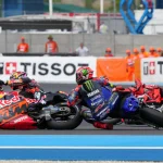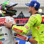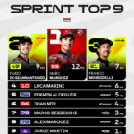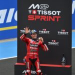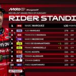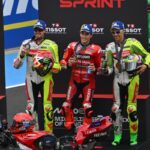 Dopo il caos al via, le posizioni di vertice sono rimaste congelate per gran parte della Tissot Sprint, con la battaglia per l’ultimo gradino del podio che a cinque giri dalla bandiera a scacchi sembrava però pronta a esplodere. Marini, quarto, si stava avvicinando a Morbidelli, portando con sé Fermin Aldeguer (BK8 Gresini Racing MotoGP). Nei passaggi successivi il distacco non è però ulteriormente sceso. All’ultimo giro Aldeguer sembrava pronto per un sorpasso su Marini, ma ha commesso una sbavatura e chiuso quinto alle spalle dell’italiano. Sul podio dunque Di Giannantonio, secondo, e Morbidelli. Il numero 49, in particolare, ha vissuto un sabato da leone nel quale ha riscattato un venerdì sottotono. Affrontata e superata la Q1, ha conquistato la prima fila in qualifica e l’argento nella Sprint. Mir ha chiuso sesto davanti a Bezzecchi. Poi Alex Marquez (BK8 Gresini Racing MotoGP) e Martin. Solo tredicesimo il vice campione del mondo Francesco Bagnaia (Ducati Lenovo Team), con un ritardo di quasi 15 secondi in 13 giri.