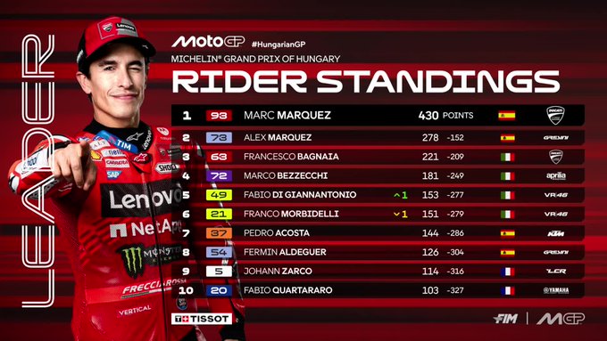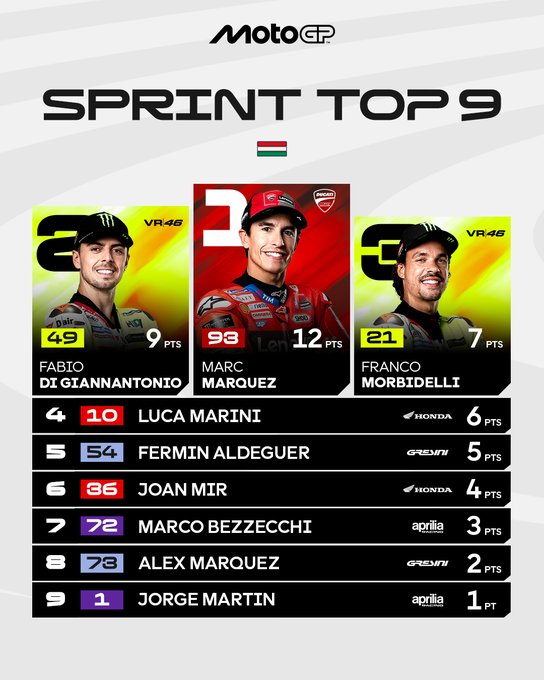 Dei 168 punti in palio finora nelle quattordici Sprint corse nel 2025, Marc Marquez ne ha lasciati per strada appena tre. Gli altri, visto il 13° oro della stagione messo al collo oggi nel GP d’Ungheria, se li è presi tutti. In marcia verso il settimo titolo in MotoGP, alla luce dell’ampio vantaggio accumulato in classifica, il 32enne del Ducati Lenovo Team nel sabato pomeriggio del Balaton Park non ha avuto rivali. Scattato dalla pole, dopo sei giri aveva oltre 1,5 secondi di vantaggio sul più veloce degli inseguitori. Due giri passaggi tardi, erano saliti a circa 2,5.