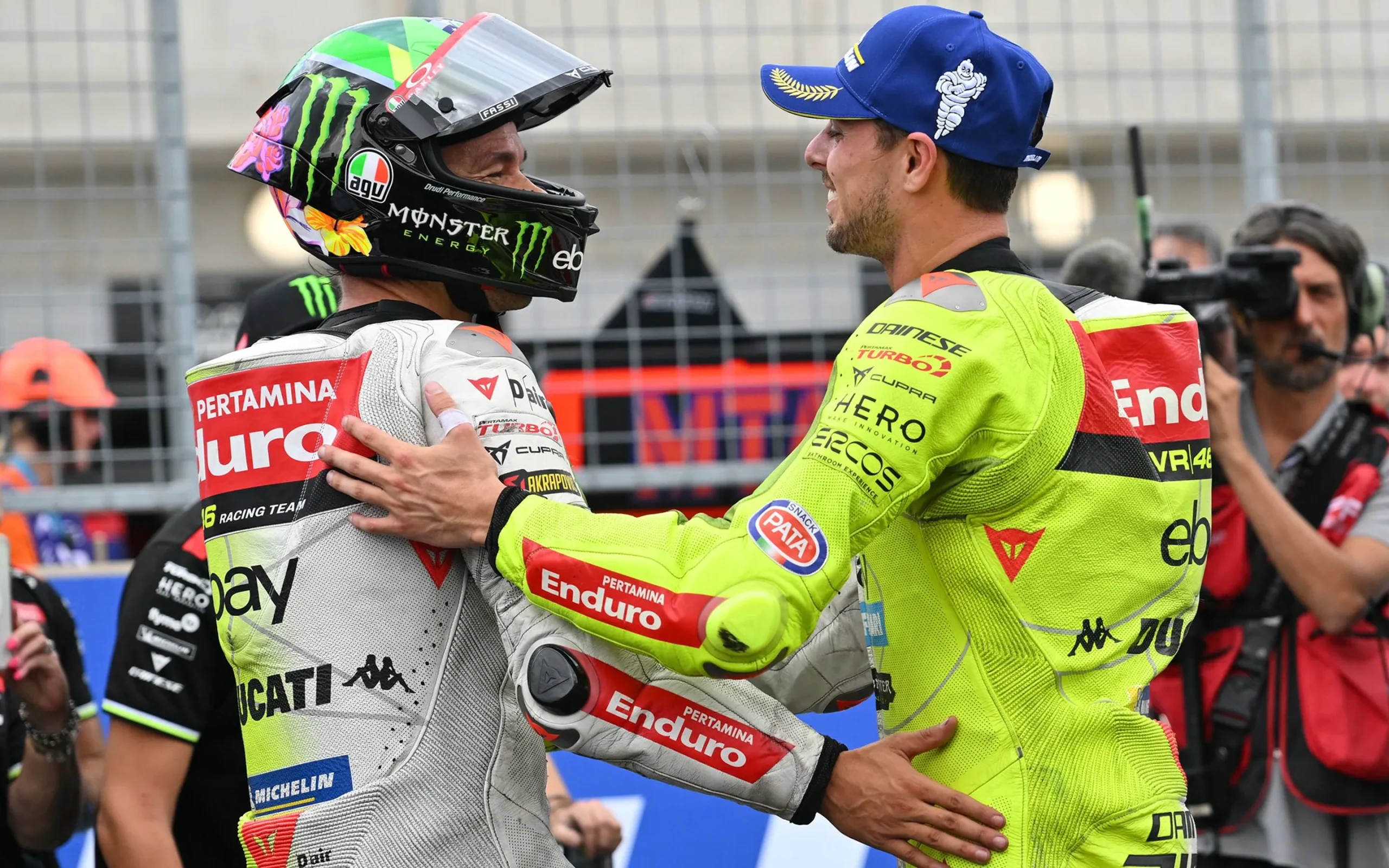 Dopo il caos al via, le posizioni di vertice sono rimaste congelate per gran parte della Tissot Sprint, con la battaglia per l’ultimo gradino del podio che a cinque giri dalla bandiera a scacchi sembrava però pronta a esplodere. Marini, quarto, si stava avvicinando a Morbidelli, portando con sé Fermin Aldeguer (BK8 Gresini Racing MotoGP). Nei passaggi successivi il distacco non è però ulteriormente sceso. All’ultimo giro Aldeguer sembrava pronto per un sorpasso su Marini, ma ha commesso una sbavatura e chiuso quinto alle spalle dell’italiano. Sul podio dunque Di Giannantonio, secondo, e Morbidelli. Il numero 49, in particolare, ha vissuto un sabato da leone nel quale ha riscattato un venerdì sottotono. Affrontata e superata la Q1, ha conquistato la prima fila in qualifica e l’argento nella Sprint. Mir ha chiuso sesto davanti a Bezzecchi. Poi Alex Marquez (BK8 Gresini Racing MotoGP) e Martin. Solo tredicesimo il vice campione del mondo Francesco Bagnaia (Ducati Lenovo Team), con un ritardo di quasi 15 secondi in 13 giri.