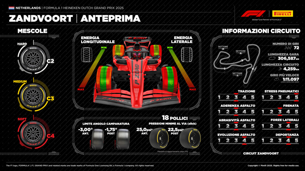 Per la gara in Olanda la Pirelli ha selezionato uno step di mescole più morbido rispetto allo scorso anno. A disposizione dei team ci saranno infatti la C2 come Hard, la C3 come Medium e la C4 come Soft mentre la terna del 2024 era composta da C1, C2 e C3. La scelta, presa in accordo con la FIA e con il promoter del campionato, ha l’obiettivo di avvicinare la strategia su una sosta, tradizionale da quando nel 2022 la gara è tornata nel calendario, a quella su due. Un ulteriore passo in questa direzione è rappresentato dalla decisione della FIA di alzare il limite di velocità in pit-lane da 60 a 80 km/h, riducendo così il tempo perso in occasione del cambio gomme. In base alle simulazioni ricevute dalle squadre, la sosta singola resta più veloce, anche perché Zandvoort è notoriamente un circuito dove i sorpassi non sono mai stati facili, sia perché i rettilinei sono pochissimi (sostanzialmente, c’è solo quello principale), sia perché la carreggiata è piuttosto stretta.