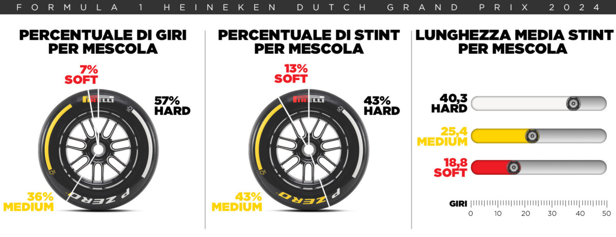 Il circuito di Zandvoort si estende per 4,259 chilometri ed è adagiato tra le dune della costa del Mare del Nord, a meno di 40 km dalla capitale dei Paesi Bassi. Il tracciato è composto da una combinazione di 14 curve (4 a sinistra e 10 a destra) a media e bassa velocità, di cui due sopraelevate: la terza e l’ultima curva hanno infatti una pendenza, rispettivamente, di 19 e 18 gradi – risultando quindi più ripide di quelle di Indianapolis. Queste curve generano forze verticali e laterali sui pneumatici molto elevate che obbligano le squadre ad una gestione attenta dell’assetto e del pacchetto vettura-gomme. Il carico aerodinamico richiesto è molto elevato, simile a quello usato a Budapest. L’asfalto ha solitamente un livello di aderenza basso ed è molto condizionato dalla presenza in pista di sabbia portata dal vento. Essendo a poche centinaia di metri dal Mare del Nord, le condizioni meteo sono molto variabili e a fine estate le temperature sono di norma già inferiori ai 20 °C. Lo stint più lungo in assoluto è stato completato da Hulkenberg con 57 giri sulle Hard. Il primato con le Medium va a Piastri (33 giri), quello con le Soft ad Hamilton (24).