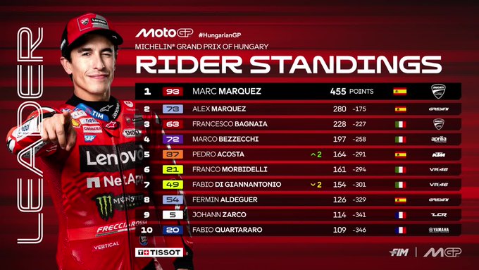 Al termine del quattordicesimo Gran Premio della stagione, Marc Márquez sale a quota 455, portando a 175 punti il suo vantaggio su Alex Márquez. Francesco Bagnaia è terzo, a 227 lunghezze di distacco dal compagno di squadra. Il Ducati Lenovo Team resta saldamente al comando della classifica a squadre (683 punti), con Ducati sempre al vertice della classifica costruttori (504 punti). Il Ducati Lenovo Team tornerà in azione dal 5 al 7 settembre a Montmeló per il Gran Premio Monster Energy di Catalunya.