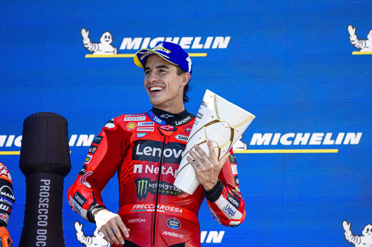 Marc Marquez (#93 Ducati Lenovo Team) – 1º: “Sono stato fortunato a non cadere dopo il contatto con Bezzecchi: non mi aspettavo che avrebbe rallentato così tanto alla curva due e gli sono finito addosso. Errore mio. Ho perso una posizione e da quel momento la mia gara ha avuto nuovamente inizio: sono rimasto paziente, avendo la gomma posteriore media a mio favore. Ho portato la gomma alla giusta temperatura e da lì ho iniziato a spingere. La scelta di gomme ha fatto davvero la differenza, perché questa mattina mi sono reso conto che, con la media, riuscivo a girare sullo stesso passo degli altri con la soft, e sapevo che col passare dei giri sarei riuscito a mantenere lo stesso ritmo”.