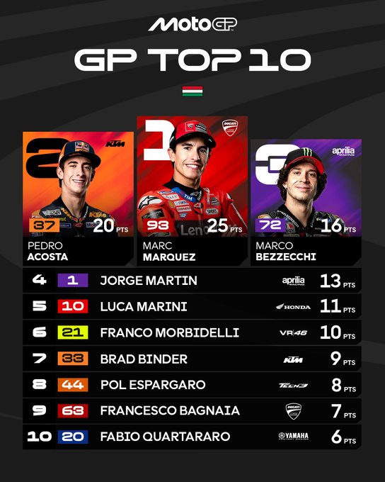 La domenica al Balaton Park si è conclusa con un bilancio molto positivo per Aprilia Racing. Marco Bezzecchi è stato ancora una volta tra i protagonisti della domenica. Il pilota italiano ha preso subito il comando alla prima curva, mantenendo la leadership per buona parte della gara con grande solidità. Nella fase finale ha ceduto la posizione, chiudendo comunque con un eccellente terzo posto e regalando alla Casa di Noale il settimo podio stagionale, tra cui la vittoria conquistata a Silverstone. Per Bezzecchi si tratta anche di un traguardo importante per la sua carriera: per la prima volta dal debutto in top class è riuscito a conquistare tre podi consecutivi in gara.