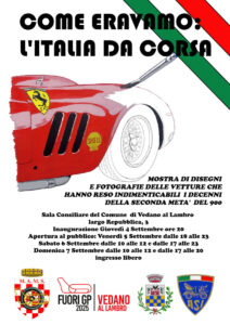Giovedì 4 settembre alle ore 20,00, presso la Sala Consiliare del Comune di Vedano, ci sarà l’inaugurazione della mostra “COME ERAVAMO: L’ITALIA DA CORSA”, un evento creato dalla Sezione Cultura del M.A.M.S. in cui verranno esposti disegni e immagini fotografiche inerenti alla storia dell’automobilismo sportivo italiani.