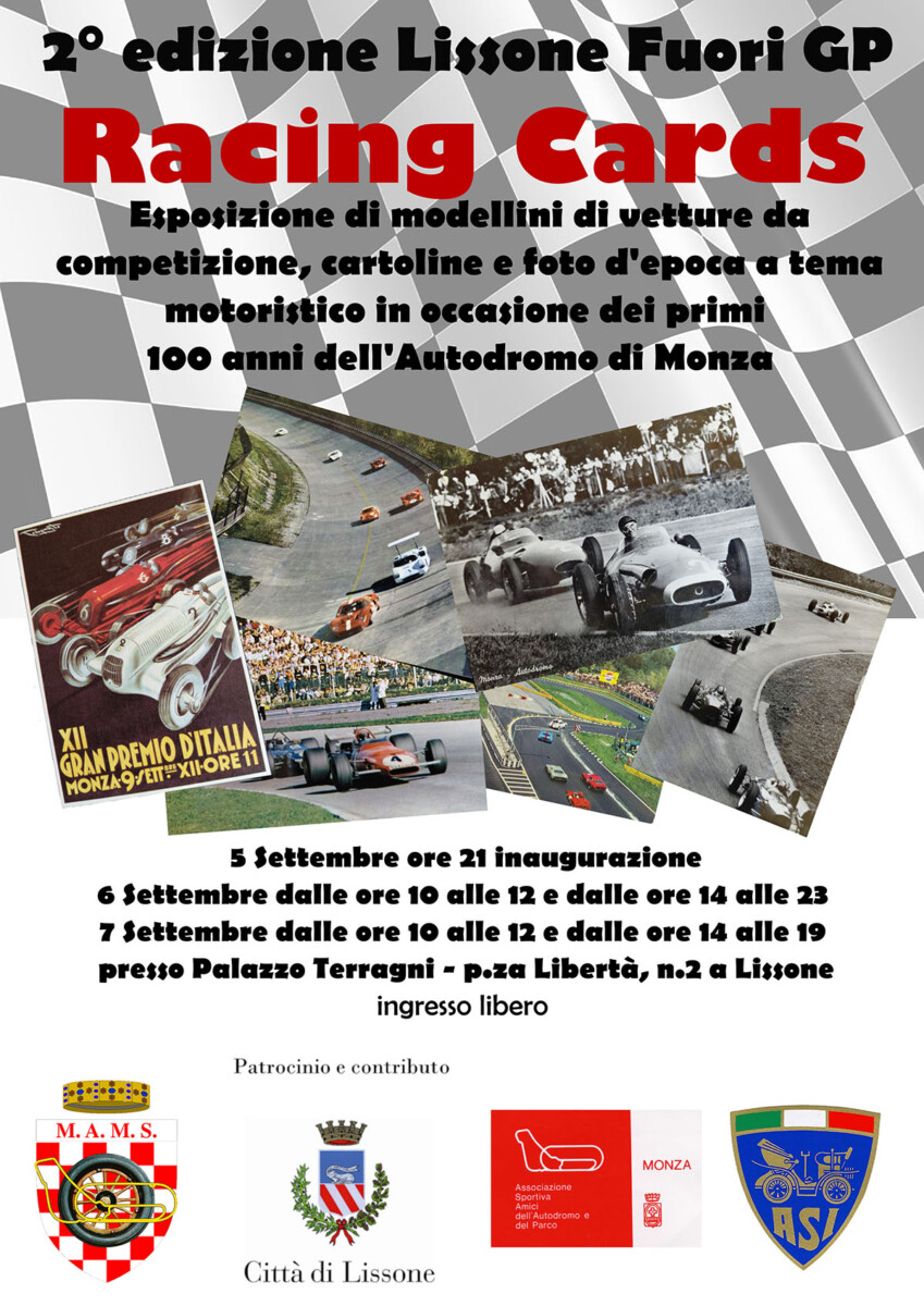 Si replica venerdì 5 settembre a Lissone, presso la sede di Palazzo Terragni con l’inaugurazione alle ore 21,00 della mostra “RACING CARDS”, altro evento ideato dal M.A.M.S. in cui verrà esposta una collezione di cartoline d’epoca inerenti alla storia dell’Autodromo di Monza e del motorsport, con una serie di modellini di vetture da competizione che hanno corso sull’asfalto della pista dell’Autodromo Nazionale.