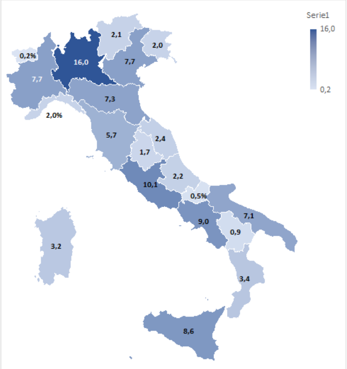 Anche a giugno l’analisi per regione conferma inalterato il podio. Lombardia al 1° posto, al 16,0% nel mese (-0,3 p.p.), Lazio al 2°, stabile al 10,1%. Campania in 3a posizione, stabile al 9,0%. Al 4° posto la Sicilia con l’8,6% (+0,4 p.p.), seguita a pari merito da Piemonte e Veneto al 7,7%.