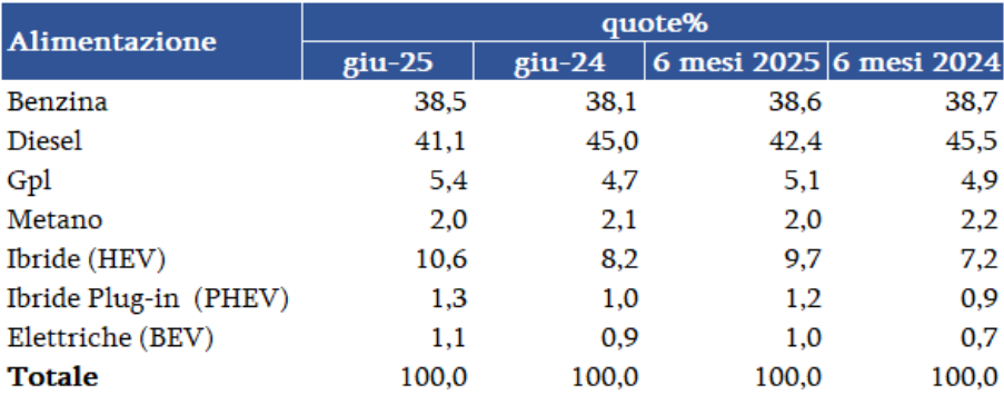 A giugno il diesel mantiene la prima posizione fra le motorizzazioni, ma continua a ridurre il suo peso, portandosi a soli 2,6 punti di distanza dal motore a benzina. Il diesel, infatti, scende al 41,1% di quota (-3,9 p.p. e al 42,4% nel cumulato), il motore a benzina guadagna 0,4 punti al 38,5% nel mese (38,6% nel semestre). Le ibride segnano una crescita sostenuta, toccando il 10,6% (9,7% nel cumulato); seguono Gpl e metano rispettivamente al 5,4% e 2,0% nel mese (5,1% e 2,0% nel cumulato); BEV e plug-in salgono all’1,1% e 1,3% in giugno (1,0% e 1,2% nei 6 mesi).