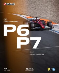 Sesto e settimo tempo per la Ferrari nelle qualifiche del GP d’Olanda, rispettivamente con Charles Leclerc e Lewis Hamilton. Nel Q3 i due sono usciti per il primo tentativo con le Soft usate nel giro abortito in precedenza. Nel tentativo finale con gomme Soft nuove, entrambi non sono riusciti a migliorare e hanno mancato la seconda fila per un decimo.