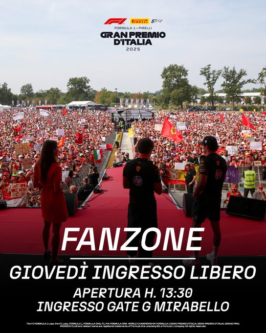 Domani, giovedì 4 settembre, il primo atto ufficiale del Formula 1 Pirelli Gran Premio d’Italia 2025 con l’apertura alle ore 13.30 della Fanzone che sarà accessibile a tutti, ovvero senza la necessità di avere alcun biglietto. L’ingresso avverrà dal Gate G (viale Mirabello). La Fanzone è un’area in cui gli appassionati potranno non soltanto dimostrare la propria abilità di guida coi simulatori o nel cambio gomme, ma anche divertirsi a suon di musica e incontrare i grandi protagonisti del Campionato del Mondo. L’apertura sarà in grande stile perché il primo appuntamento, fissato alle ore 14.05, è con il team principal della Scuderia Ferrari HP, Frederic Vasseur. Alle 16.30, invece, Andrea Kimi Antonelli sarà protagonista di una intervista e successiva sessione autografi presso uno stand interamente dedicato a lui.
