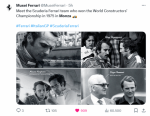 In occasione del GP d’Italia a Monza, la Scuderia Ferrari rende omaggio al cinquantesimo anniversario del primo Titolo mondiale conquistato da Niki Lauda. Correva l’anno 1975 e l’austriaco, al volante della fantastica Ferrari 312 T, scrisse una pagina fondamentale nella storia del team e dell’azienda che visse il suo culmine proprio all’Autodromo Nazionale, davanti a una marea di tifosi che si arrampicarono ovunque – anche dove non si poteva – per assistere dal vivo a quel momento. Quella domenica 7 settembre, con il successo colto da Clay Regazzoni sull’altra Ferrari, e il terzo posto di Lauda, veniva infatti sancito il ritorno al vertice della Scuderia, di nuovo prima tanto nella classifica Piloti che tra i Costruttori, ponendo fine a undici anni di attesa e aprendo un ciclo che sarebbe durato (con una sola eccezione) fino al 1979.