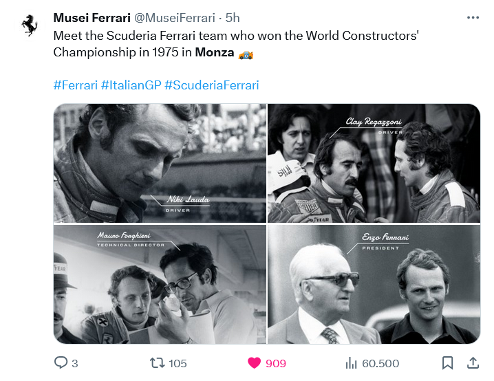 La 312 T al Museo di Maranello. A partire da domani, e per tutto il mese di settembre, gli appassionati che visiteranno il Museo Ferrari di Maranello avranno il privilegio di poter vedere con i propri occhi la Ferrari 312 T guidata da Niki Lauda nella trionfale stagione 1975. Oltre a questa storica monoposto ci sarà anche una vettura nella speciale livrea di Monza questo weekend. Il Museo Ferrari merita sempre una visita, ma in questo periodo per una doppia buona ragione: sia perché i visitatori potranno vedere un allestimento del Museo completamente rinnovato di recente, sia perché nel fine settimana oltre alle vetture in esposizione sarà infatti possibile assistere alla diretta della qualifica di sabato alle 16 CEST e del Gran Premio, in programma alle 15 di domenica.