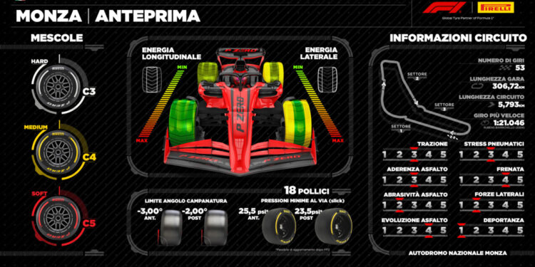 Non cambia la selezione di mescole per il GP d’Italia: all’Autodromo Nazionale Monza verranno infatti utilizzate la C3 come Hard, la C4 come Medium e la C5 come Soft, esattamente come lo scorso anno, quando la pista era stata appena riasfaltata. Dopo dodici mesi di utilizzo, l’asfalto avrà inevitabilmente subito un processo di invecchiamento, ma ciò non dovrebbe incidere in maniera sostanziale sul ventaglio di strategie possibili sul circuito che richiede il carico aerodinamico più basso di tutta la stagione.