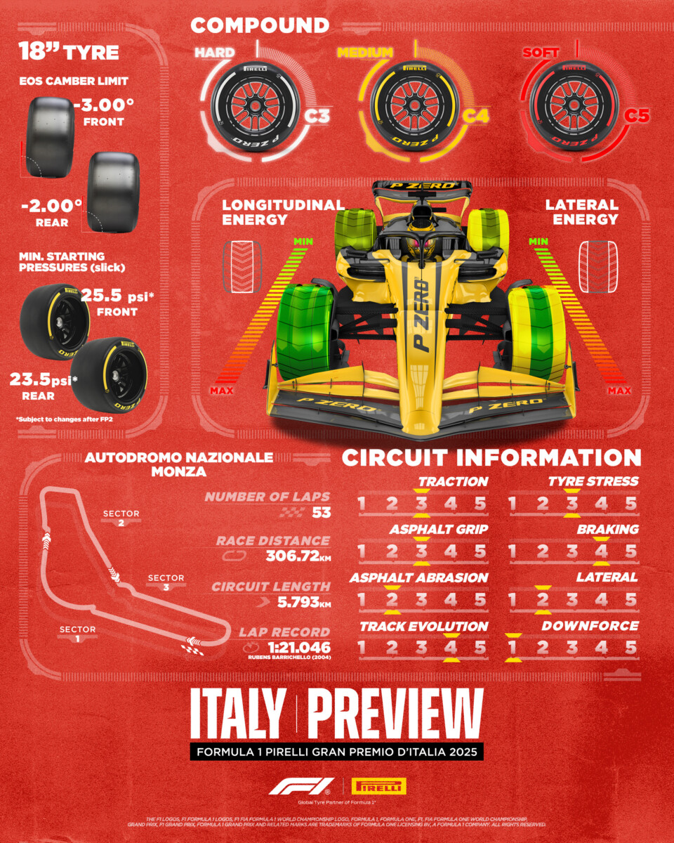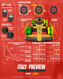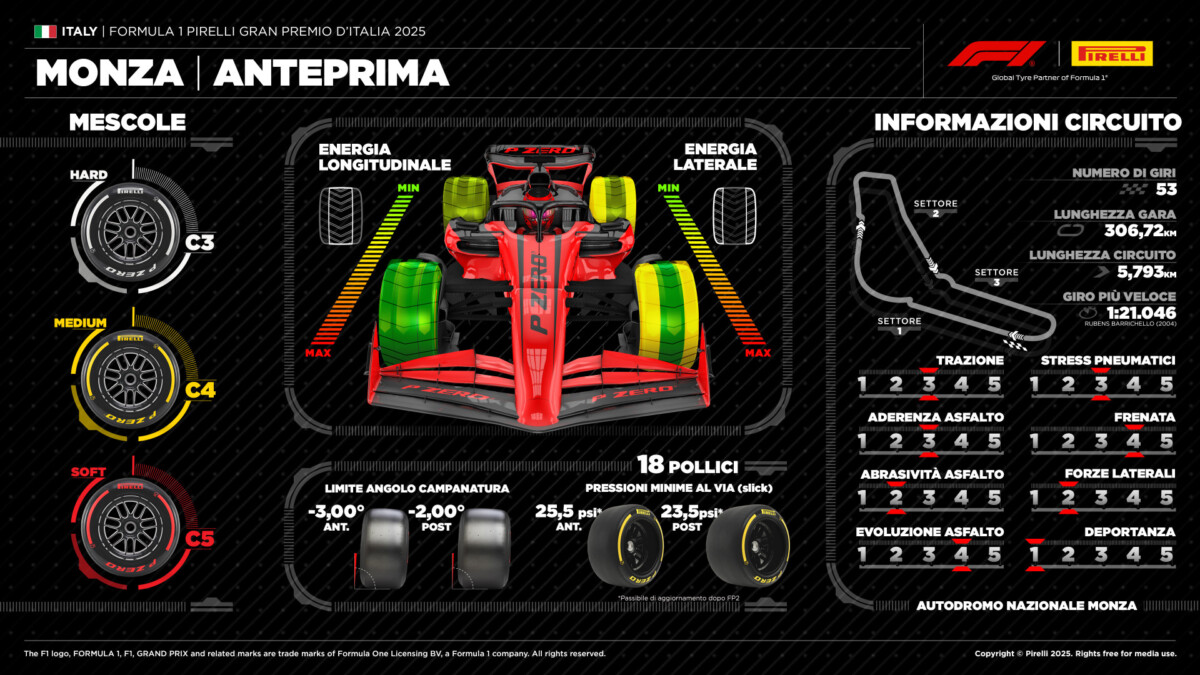 Non cambia la selezione di mescole per il GP d’Italia: all’Autodromo Nazionale Monza verranno infatti utilizzate la C3 come Hard, la C4 come Medium e la C5 come Soft, esattamente come lo scorso anno, quando la pista era stata appena riasfaltata. Dopo dodici mesi di utilizzo, l’asfalto avrà inevitabilmente subito un processo di invecchiamento, ma ciò non dovrebbe incidere in maniera sostanziale sul ventaglio di strategie possibili sul circuito che richiede il carico aerodinamico più basso di tutta la stagione.