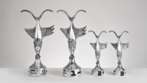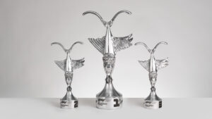 Il tema della mitologia e della velocità, già esplorato con “Tifone” nel 2022, si ripresenta quest’anno con “Chimera”. L’enigmatica figura scultorea creata da Vascellari rappresenta l’idea stilizzata di movimento dei tre animali più veloci d’aria, d’acqua e di terra: rispettivamente, il falco pellegrino, il pesce vela e il ghepardo. Le loro peculiarità aerodinamiche – legate all’ala e agli artigli per l’uccello, alla coda per il felino, alla pinna per il pesce – sono fuse in un’unica specie fantastica che richiama l’evoluzione, la metamorfosi e il cambiamento. I trofei sono realizzati in alluminio – materiale leggero utilizzato anche nelle monoposto di Formula 1 – attraverso un processo che, partendo da un disegno bidimensionale poi trasposto con modellazione organica e stampa 3D in resina, culmina nella fusione a cera persa, tra le più antiche tecniche scultoree, unendo così competenze artigianali ad altre altamente innovative.