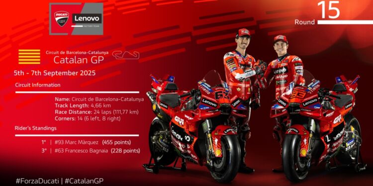 Il Circuit de Barcelona-Catalunya ospita la quindicesima gara del calendario MotoGP, con il primo match point disponibile per la classifica costruttori. Per Ducati, si tratterebbe del sesto titolo consecutivo, il settimo in totale per la casa di Borgo Panigale. Il circuito di Montmeló è da sempre un tracciato storico per Ducati: Loris Capirossi conquistò qui nel 2003 la prima vittoria nella Premier Class in sella alla Desmosedici GP seguita dai trionfi di Stoner nel 2007, Dovizioso nel 2017, Lorenzo nel 2018 e Bagnaia nel 2024 (vincitore sia al Catalan GP che al Solidarity GP a fine stagione).