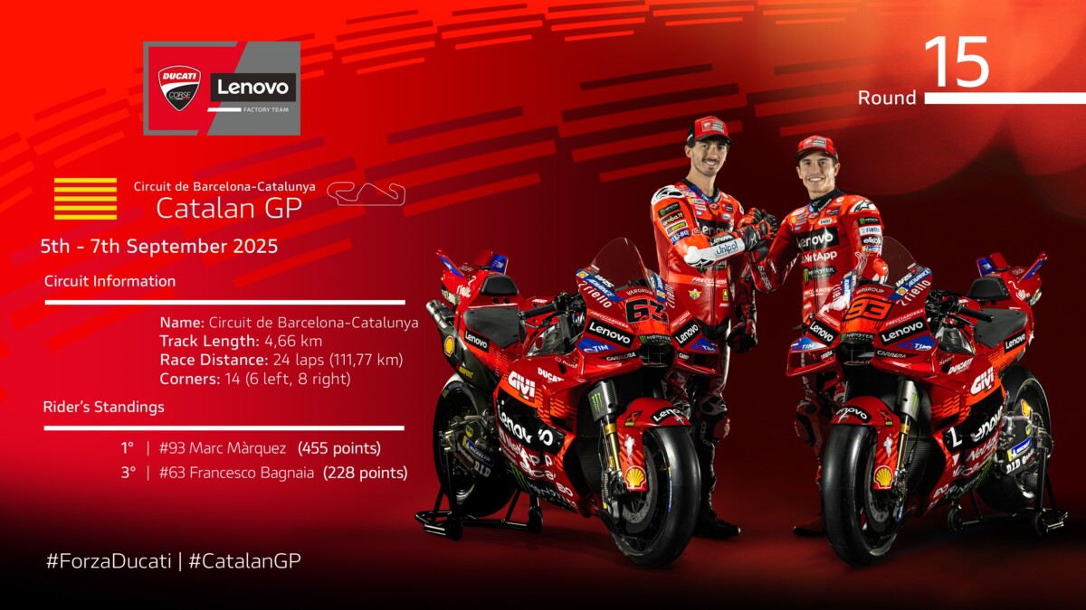 Il Circuit de Barcelona-Catalunya ospita la quindicesima gara del calendario MotoGP, con il primo match point disponibile per la classifica costruttori. Per Ducati, si tratterebbe del sesto titolo consecutivo, il settimo in totale per la casa di Borgo Panigale. Il circuito di Montmeló è da sempre un tracciato storico per Ducati: Loris Capirossi conquistò qui nel 2003 la prima vittoria nella Premier Class in sella alla Desmosedici GP seguita dai trionfi di Stoner nel 2007, Dovizioso nel 2017, Lorenzo nel 2018 e Bagnaia nel 2024 (vincitore sia al Catalan GP che al Solidarity GP a fine stagione).